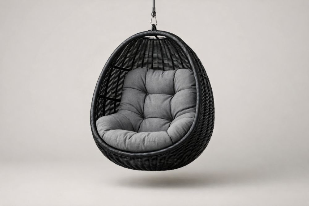 Chaise Suspendue en Rotin Noir avec Coussin Gris