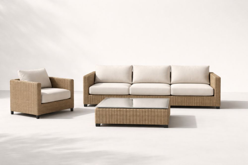 Liste des produits : Canapé trois places, fauteuil, table basse, coussins de siège et de dossier