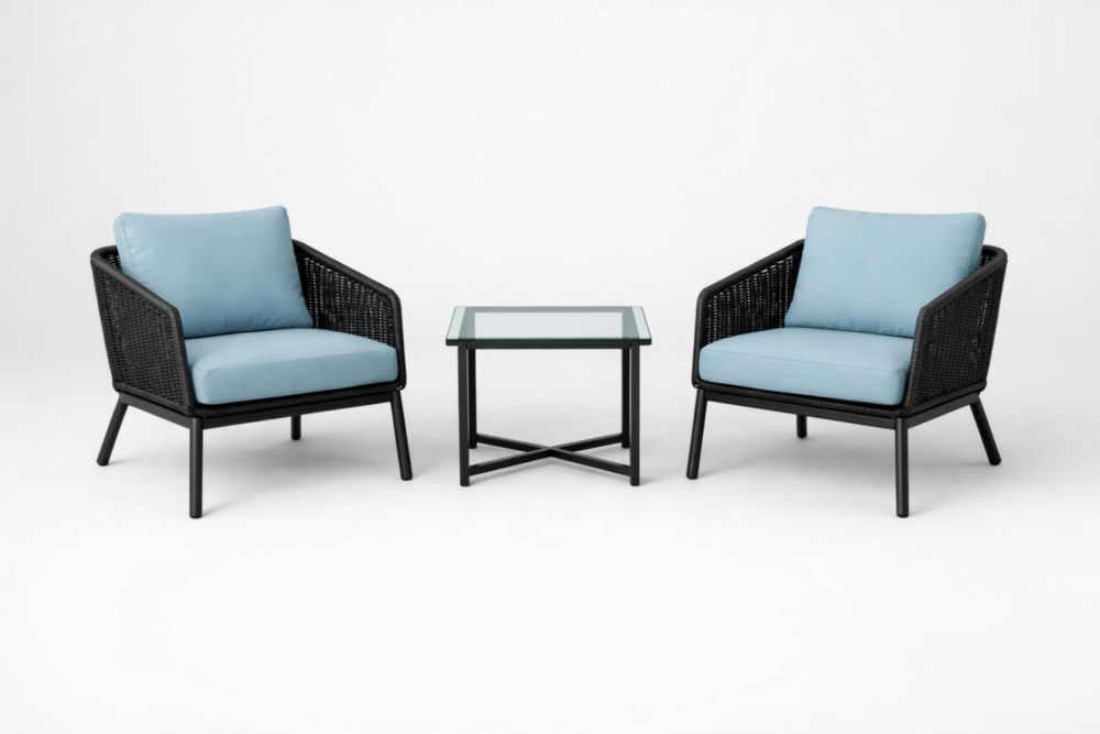 Ensemble de salon extérieur 2 fauteuils rotin noir coussins bleus table basse verre