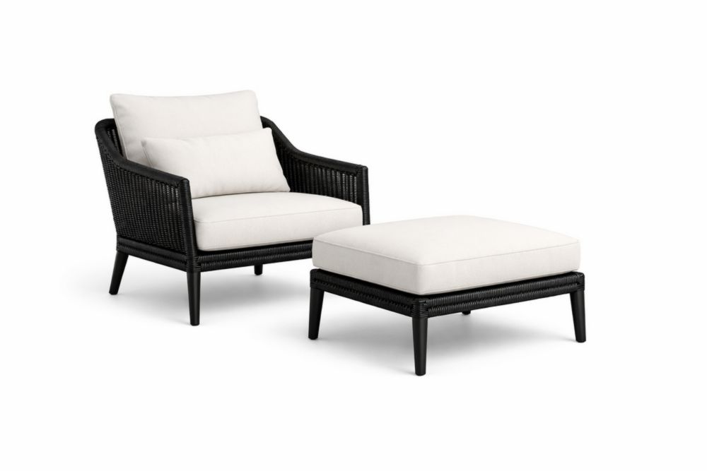 Fauteuil et repose-pieds en résine tressée et tissu polyester Noir et Blanc