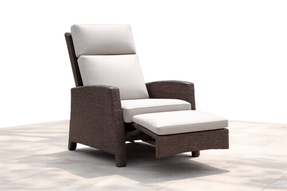 Fauteuil inclinable de jardin en rotin brun avec coussins en polyester beige