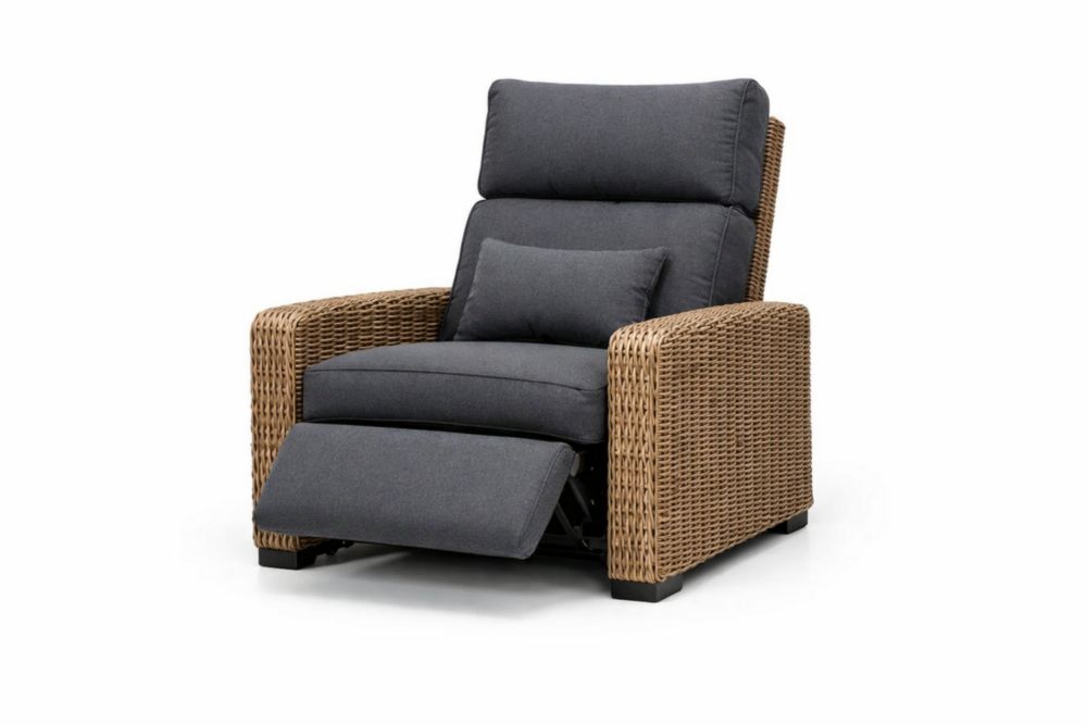 Ce fauteuil relax est fabriqué en rotin synthétique résistant avec un cadre durable. Les coussins sont en polyester de couleur grise et remplis de mousse de polyuréthane. Le dossier et le repose-pieds sont réglables pour une position de détente. Le produit pèse 24 kg, et ses dimensions sont de 105 cm de hauteur, 77 cm de largeur et 90 cm de profondeur. Les coussins sont amovibles pour un entretien facile. Inclure coussin de dossier.